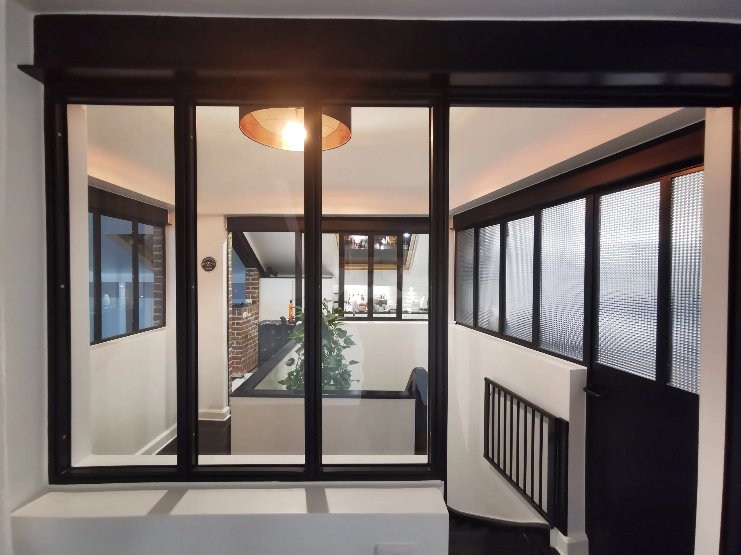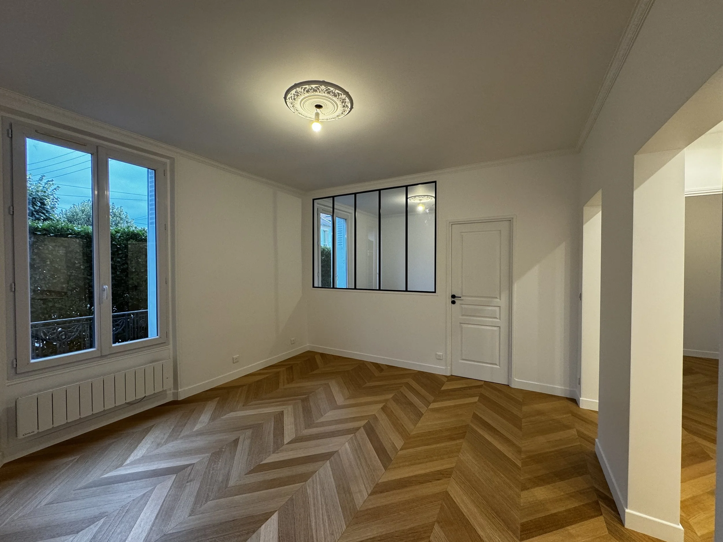 Rénovation totale appartement, ouverture espace avec suppression de cloisons non-porteuses et création verrière artiste sur cuisine/salon. Réfection intégrale de 2 salles-de-bain et cuisine, création d’un espace buanderie, restauration parquet tout appartement.