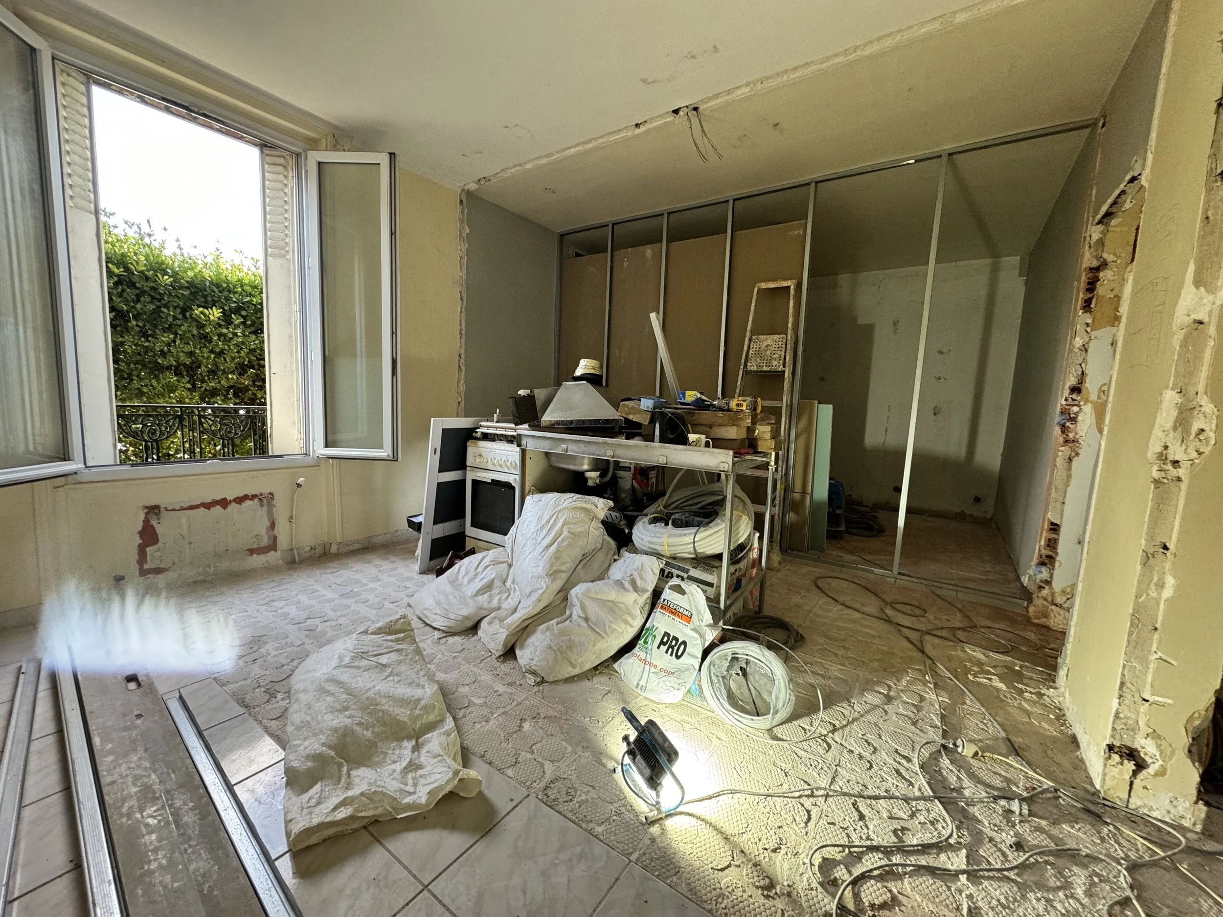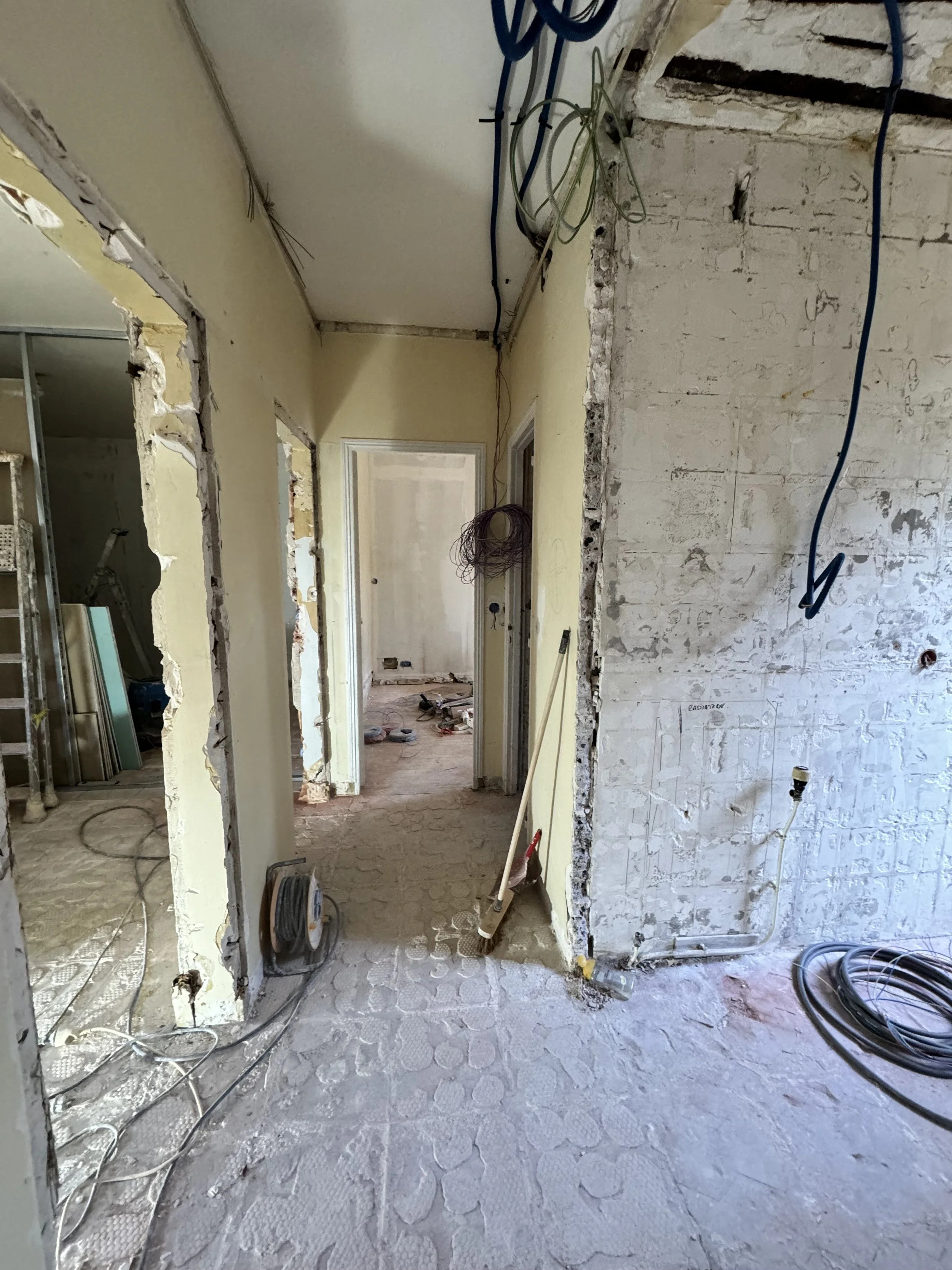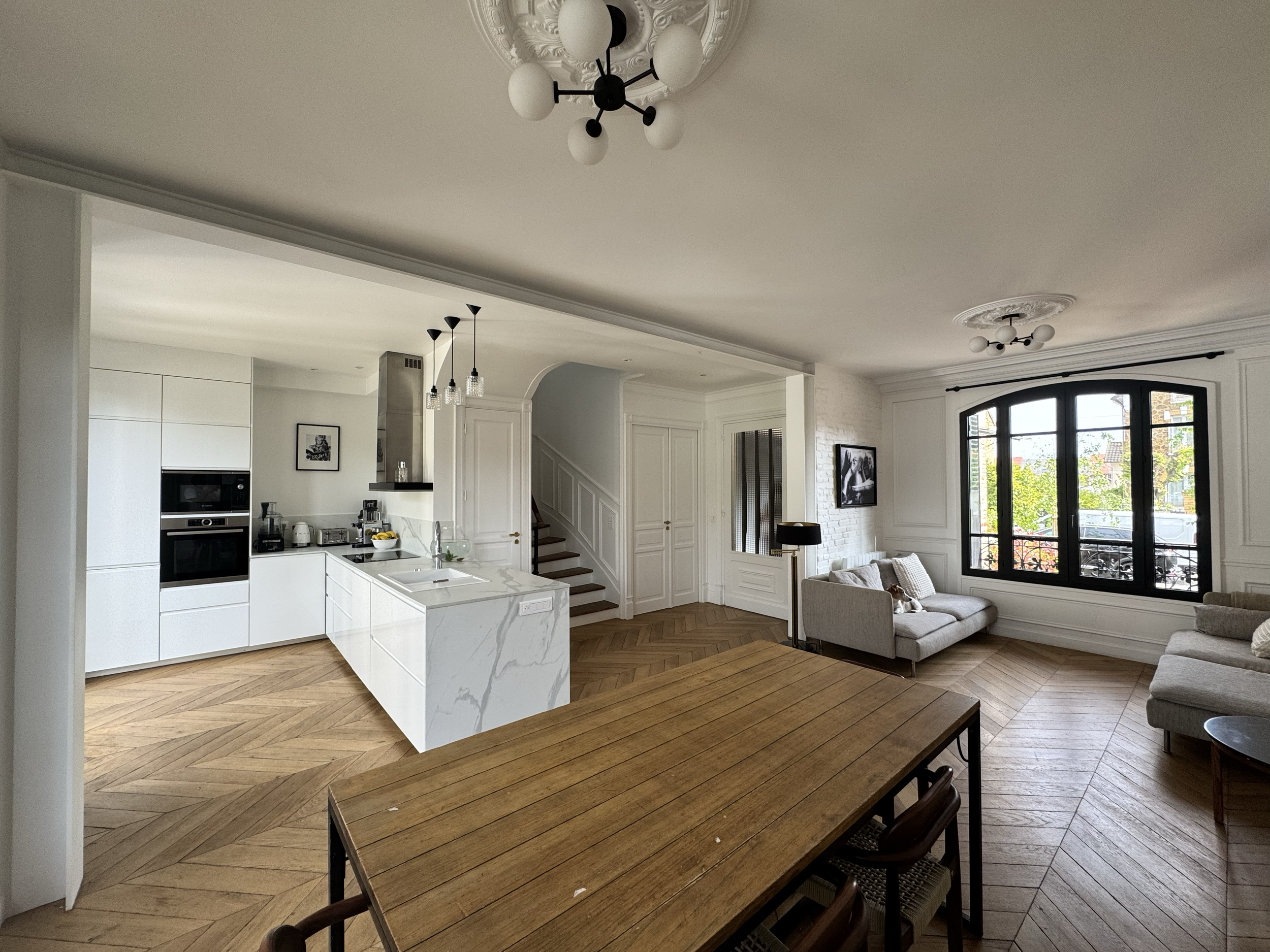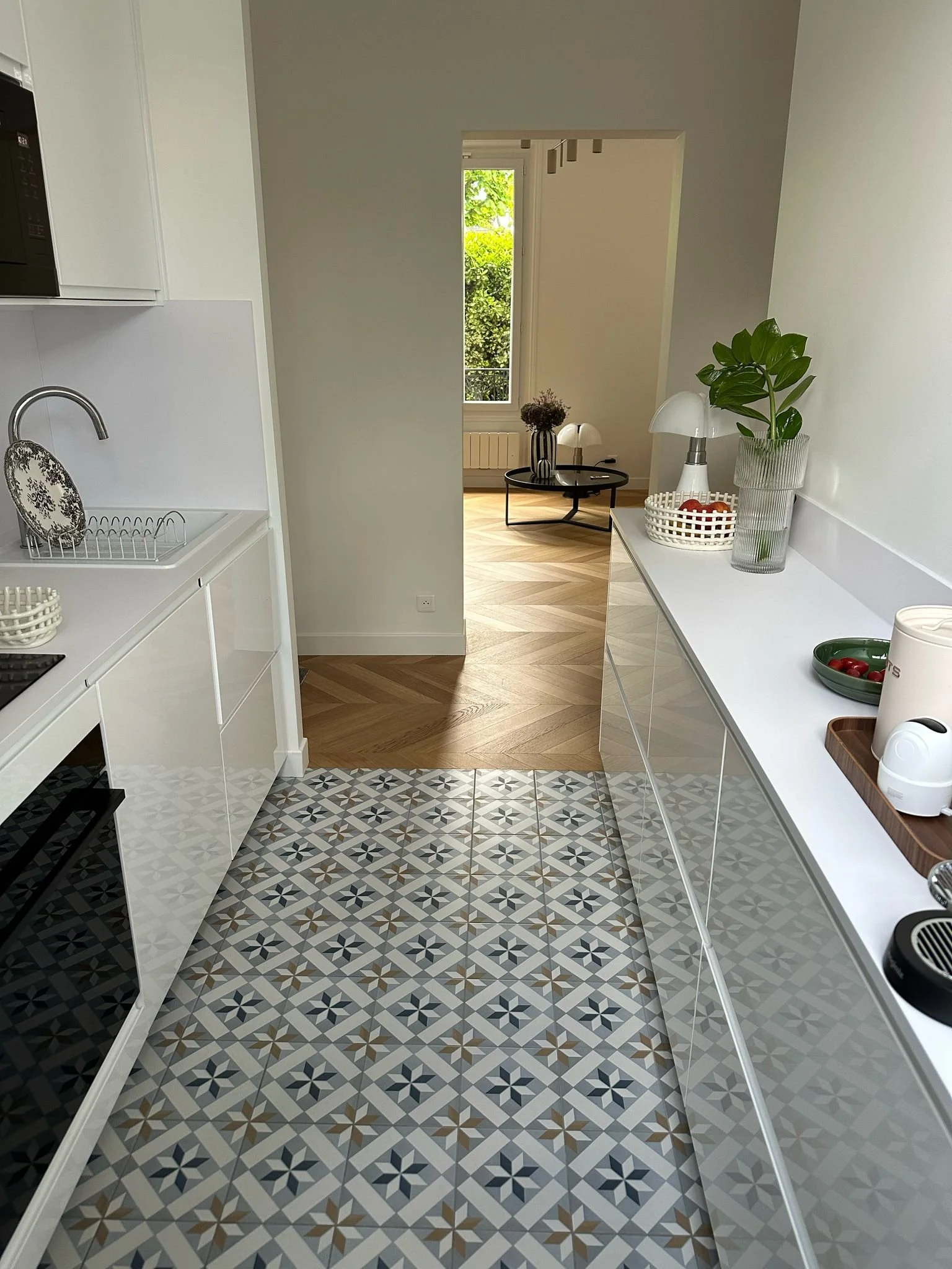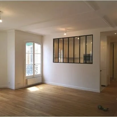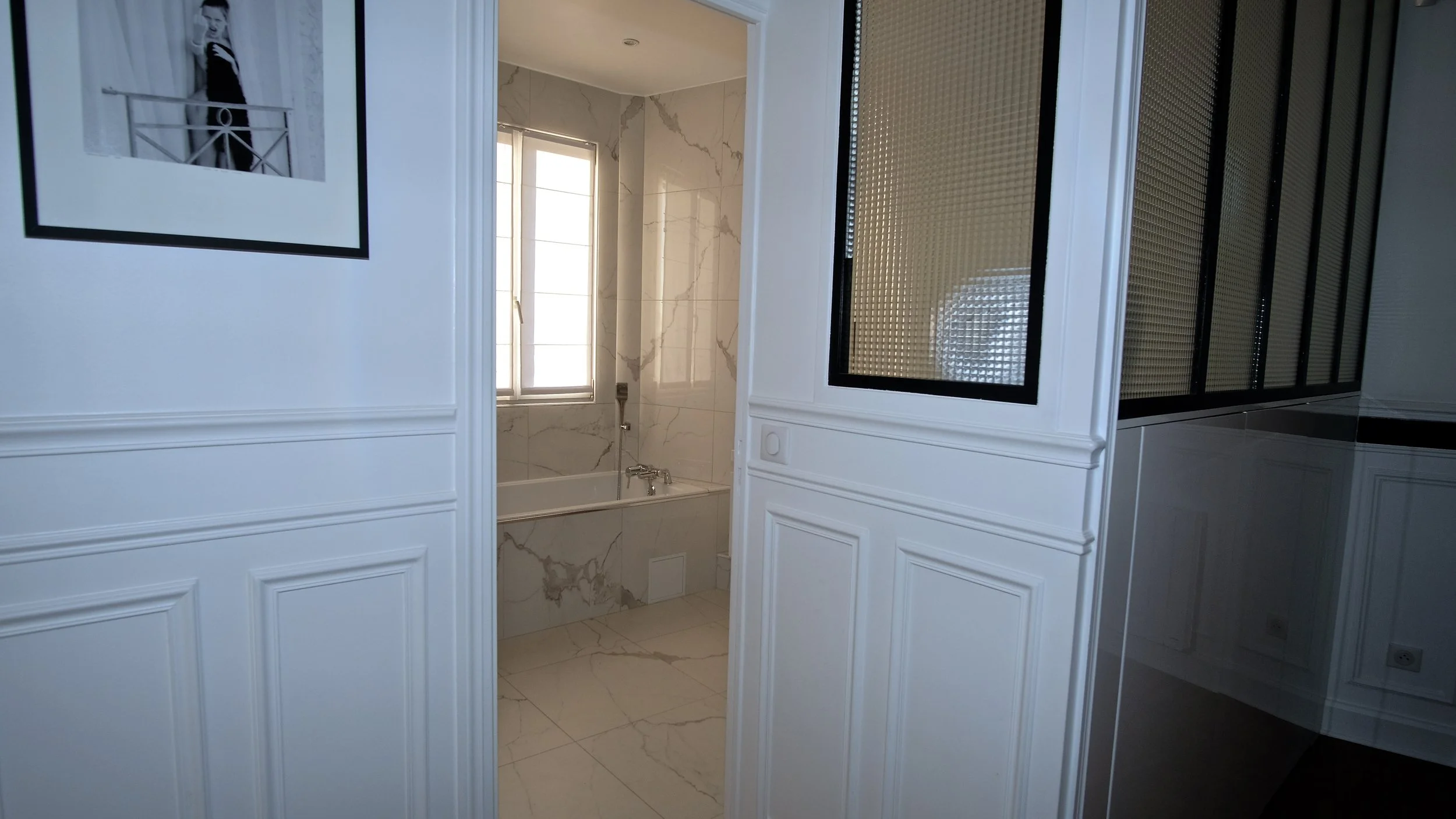 Rénovation totale appartement, ouverture espace avec suppression de cloisons non-porteuses et création verrière artiste sur cuisine/salon. Réfection intégrale de 2 salles-de-bain et cuisine, création d’un espace buanderie, restauration parquet tout appartement.