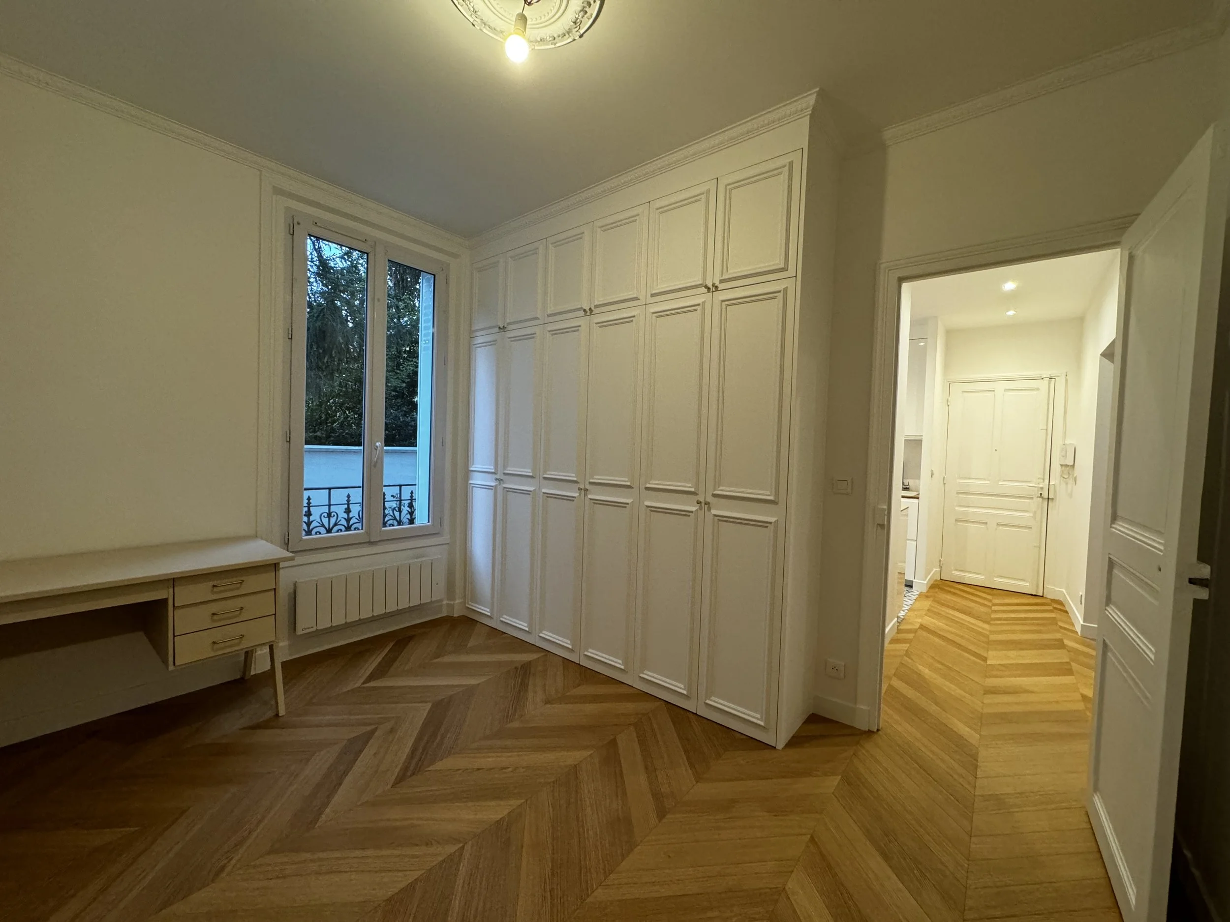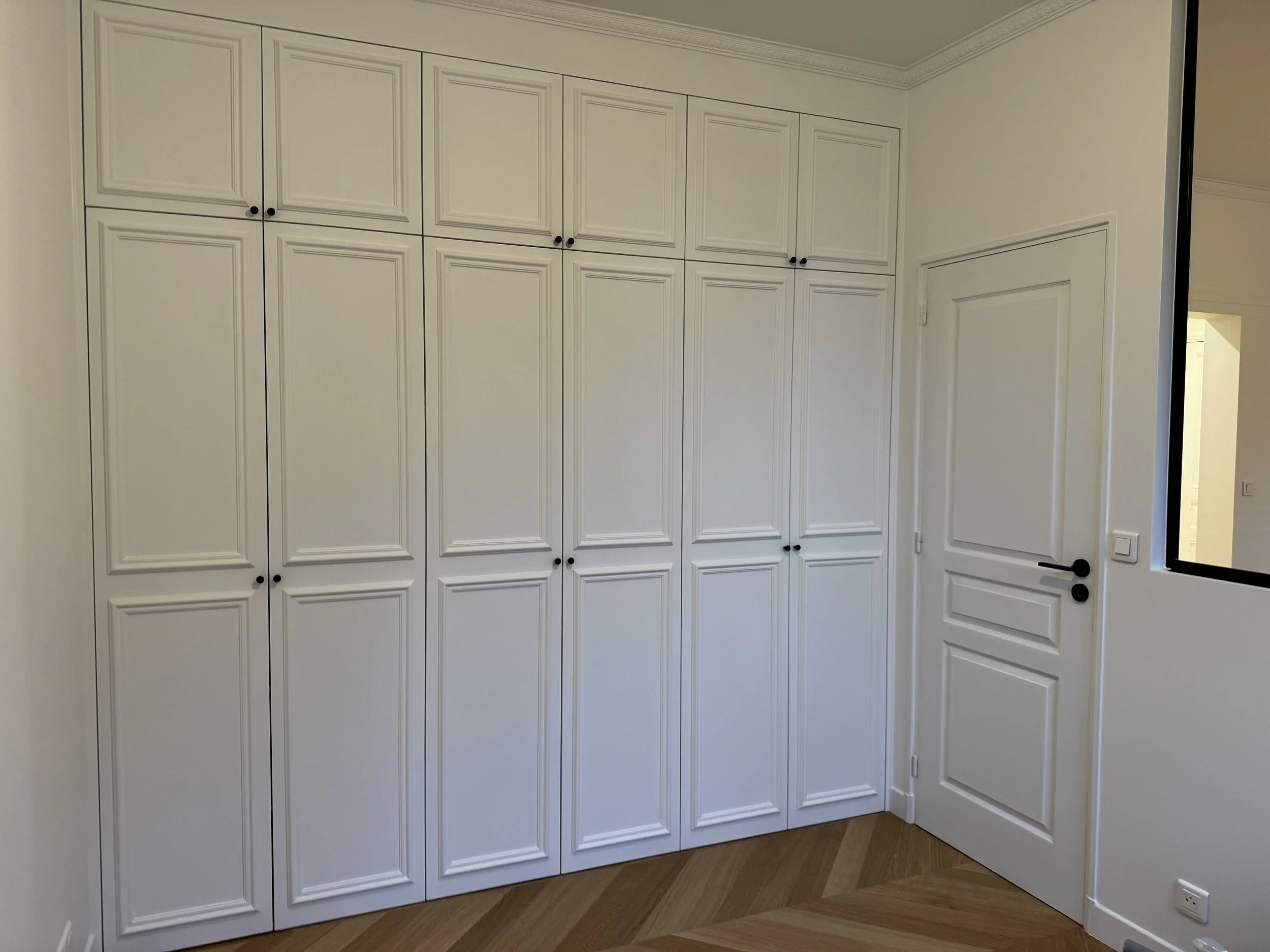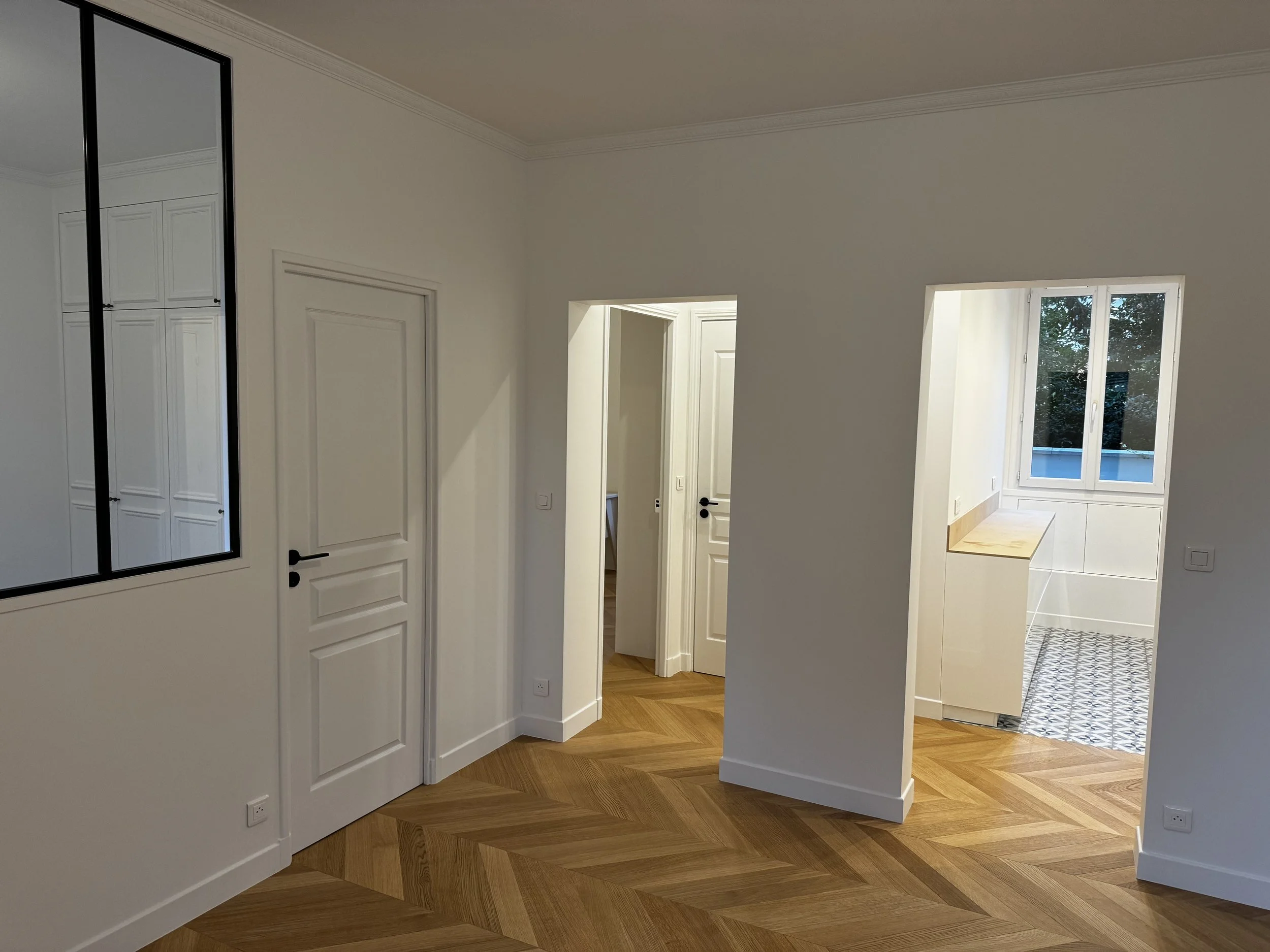 Rénovation totale appartement avec une ouverture cuisine et re-dimension du salon et de la chambre parentale avec installation d’une verrière pour maximiser la luminosité. Pose d’un parquet de en pose de Hongrie massif. Créations de grands placards sur-mesure dans les deux chambres. Modernisation de la cuisine et salle-de-bain pour un rendu très chic.