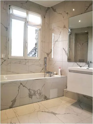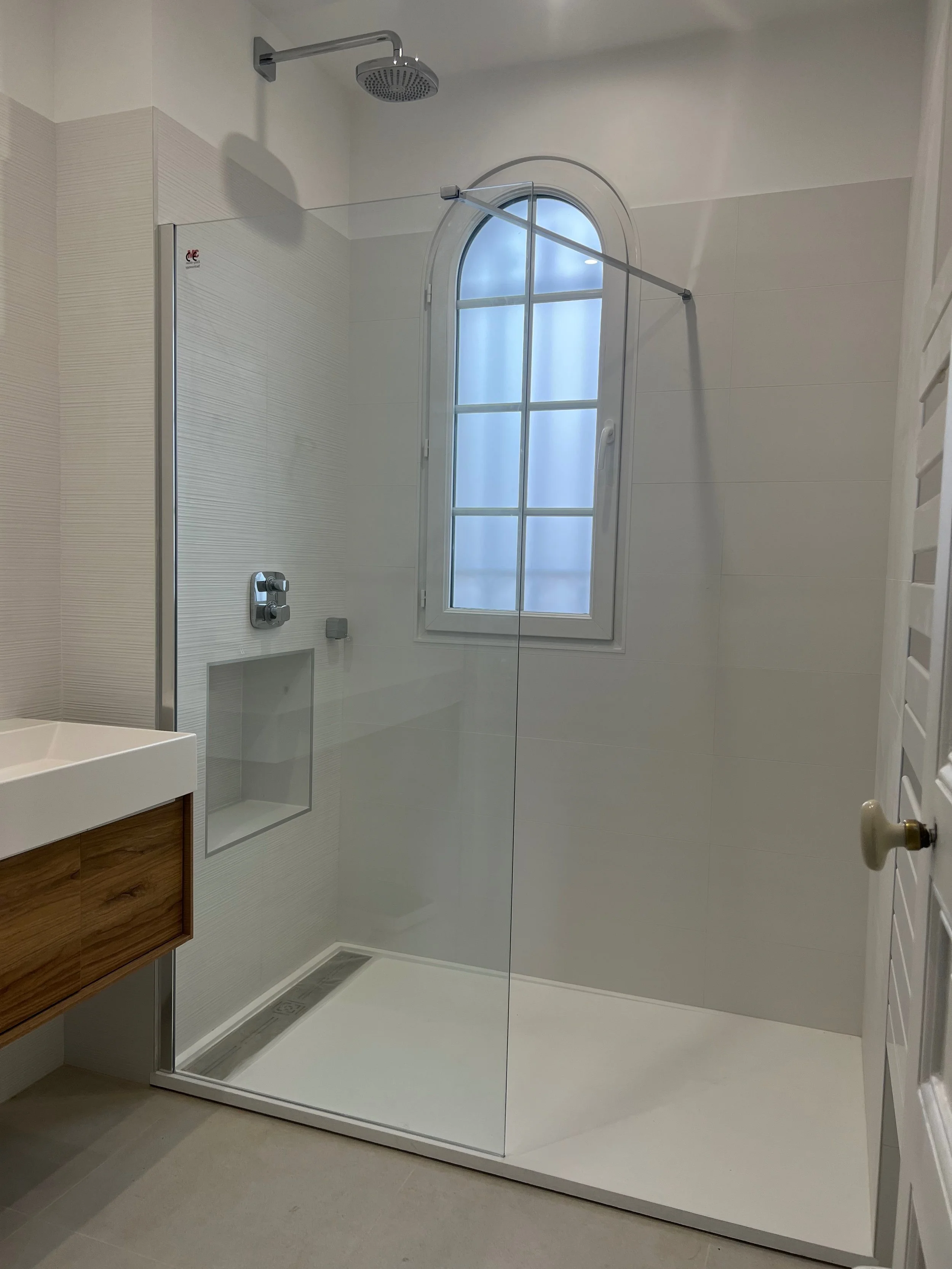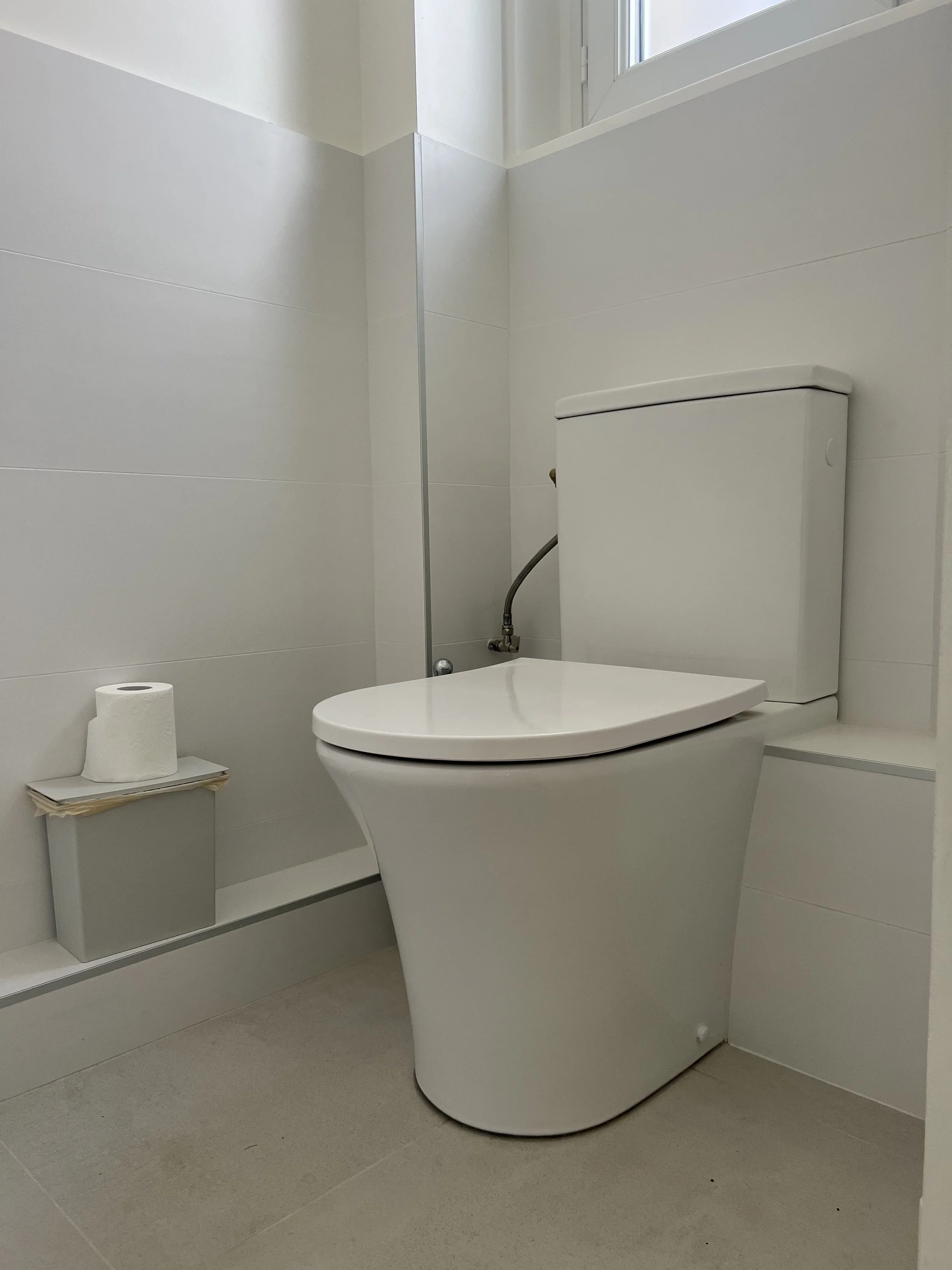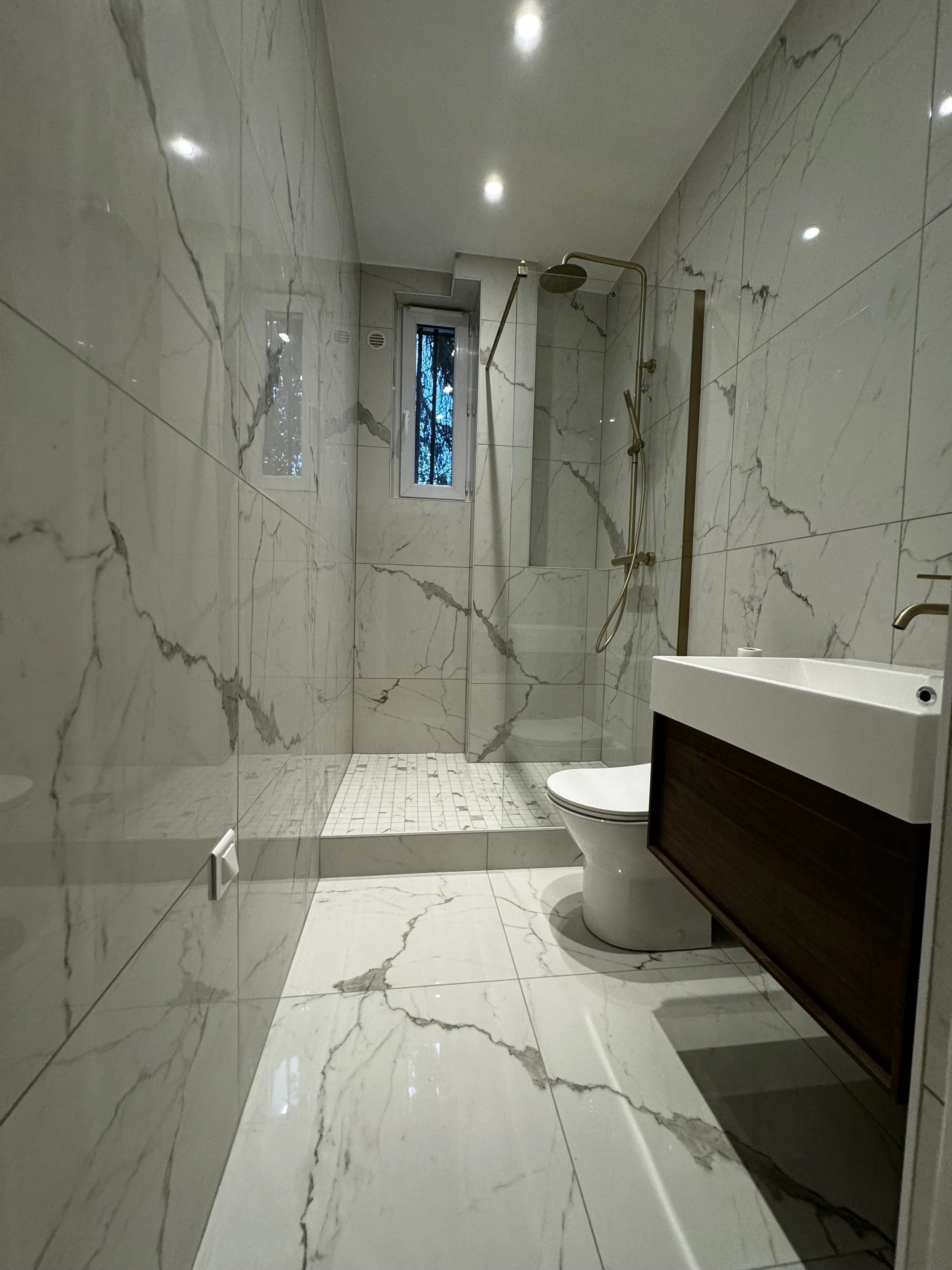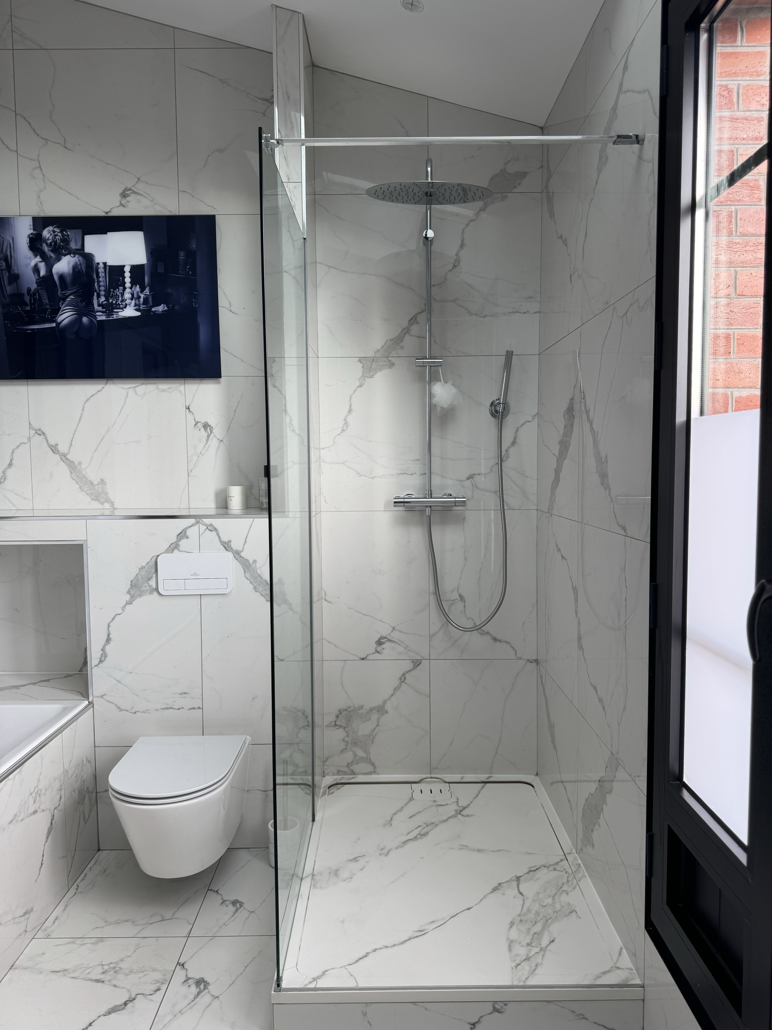 Rénovation totale d’une salle-de-bain-wc avec une douche à l’Italienne grand format . Pour une salle-de-bain moderne et épurée.