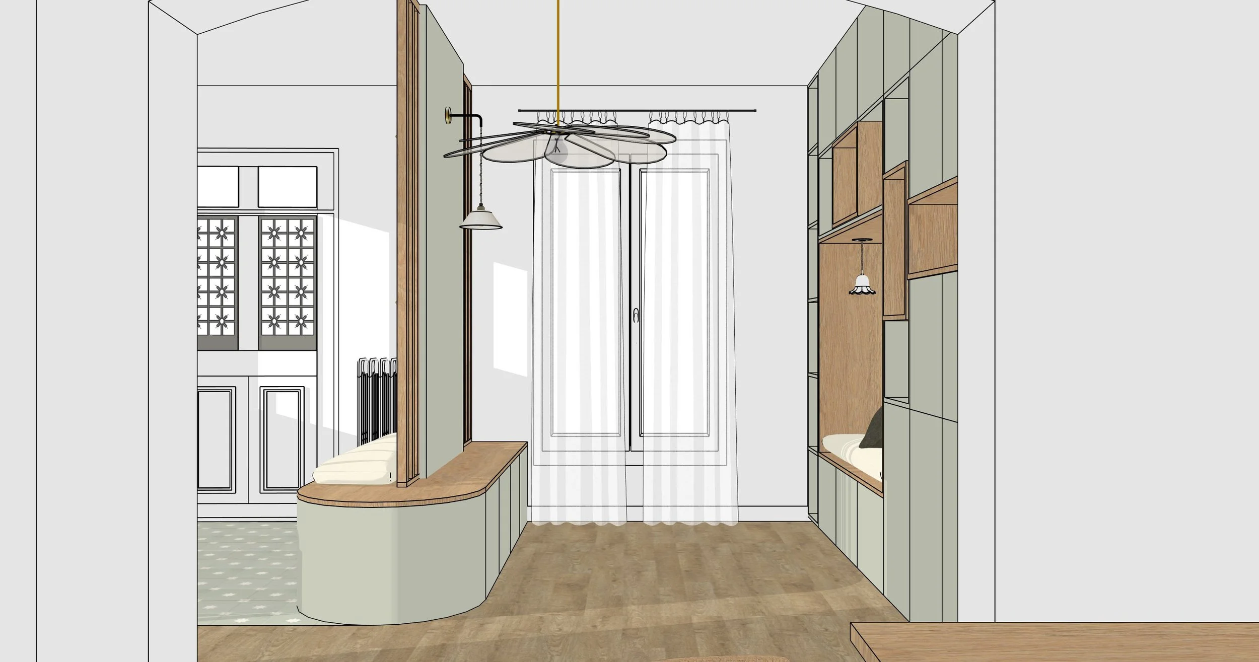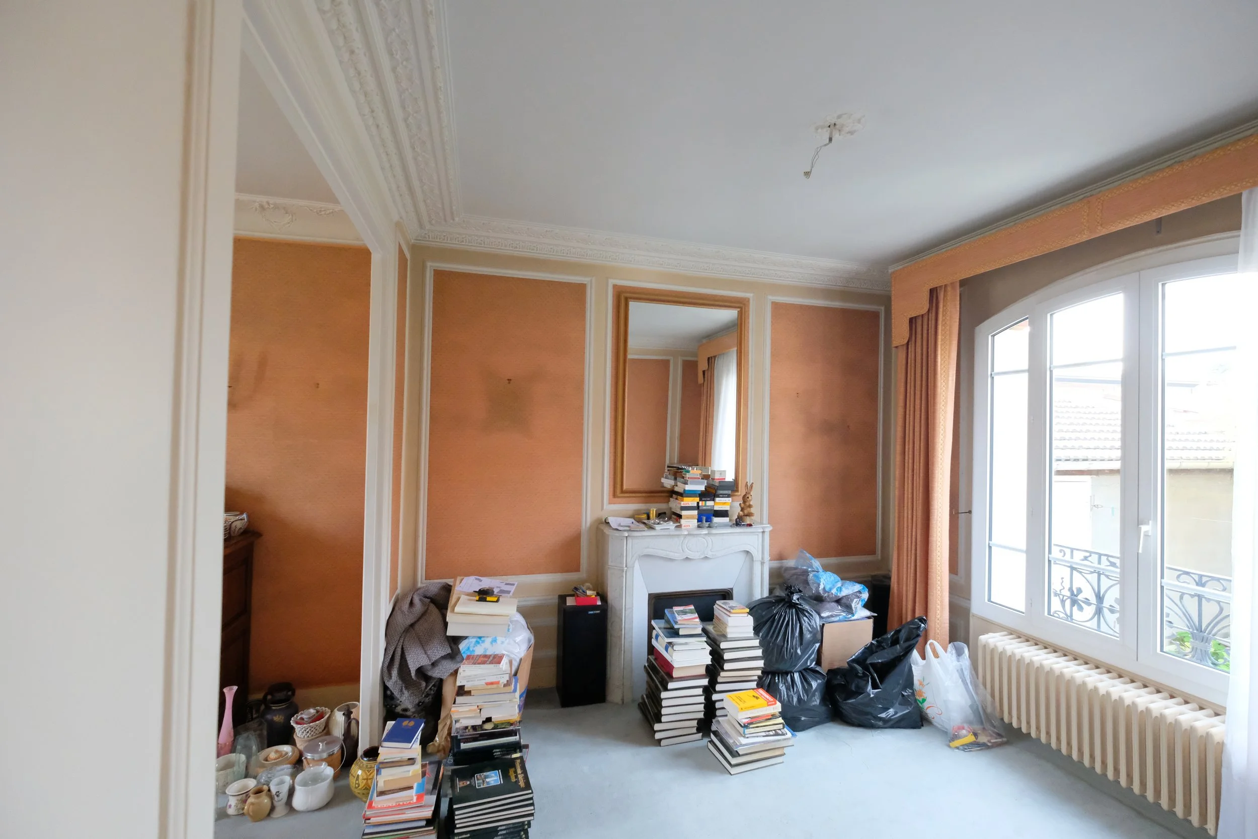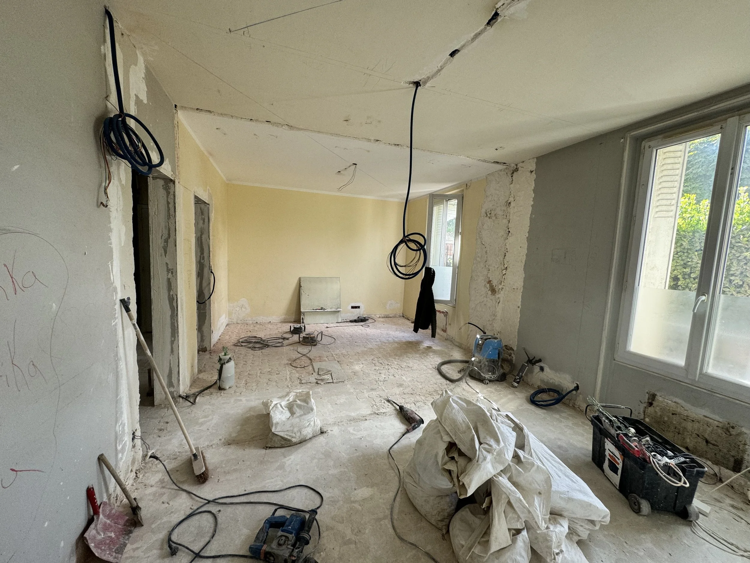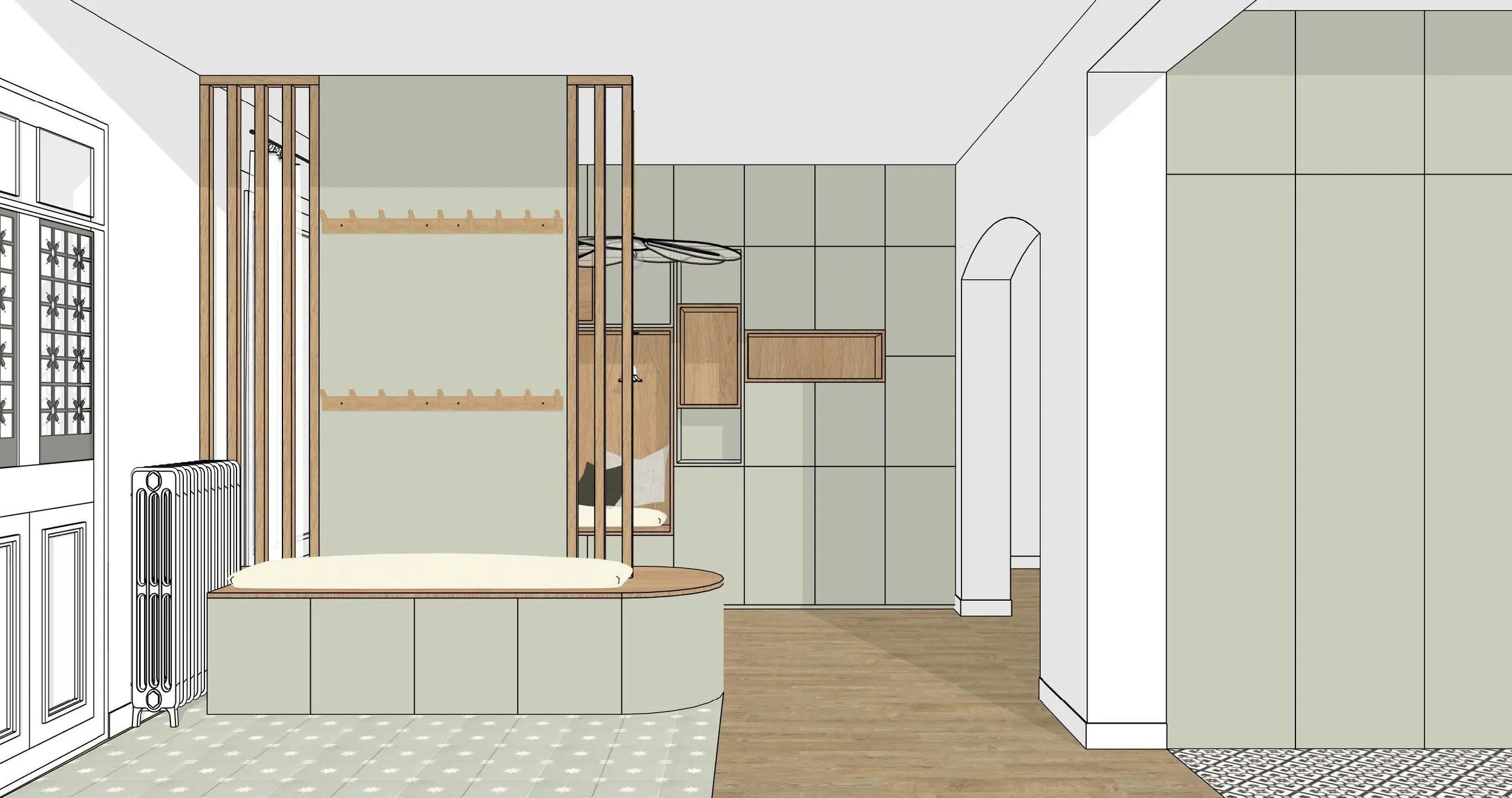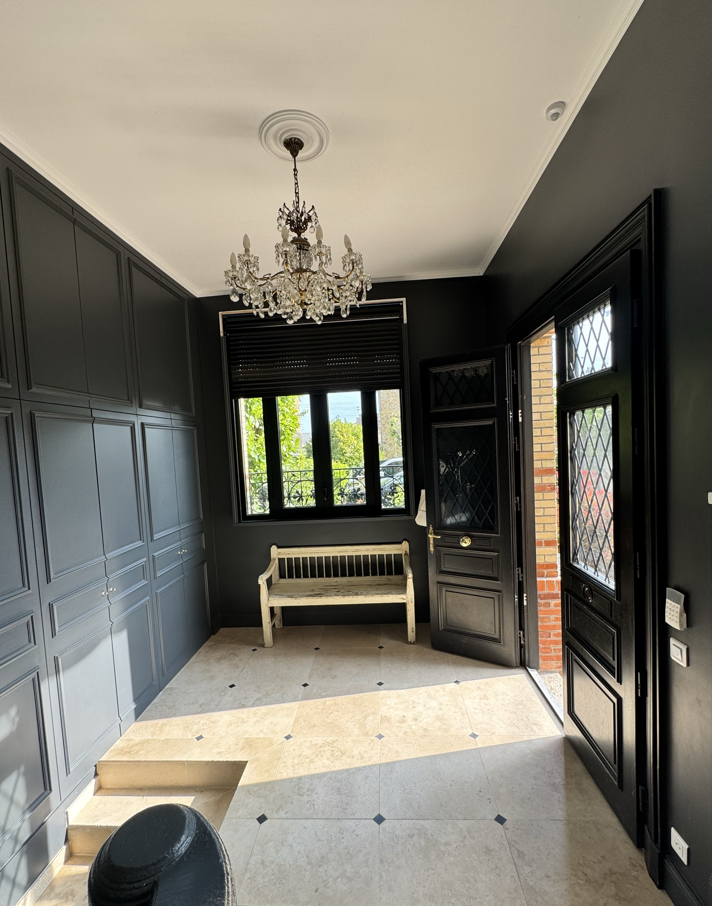 Rénovation complète de l’entrée, du salon de la maison. Réfection des murs, du plafond et des sols ainsi que la création d’une bibliothèque et d’un meuble d’entrée sur-mesure. Une nouvelle division de l’espace conforme au plan de l’architecte.